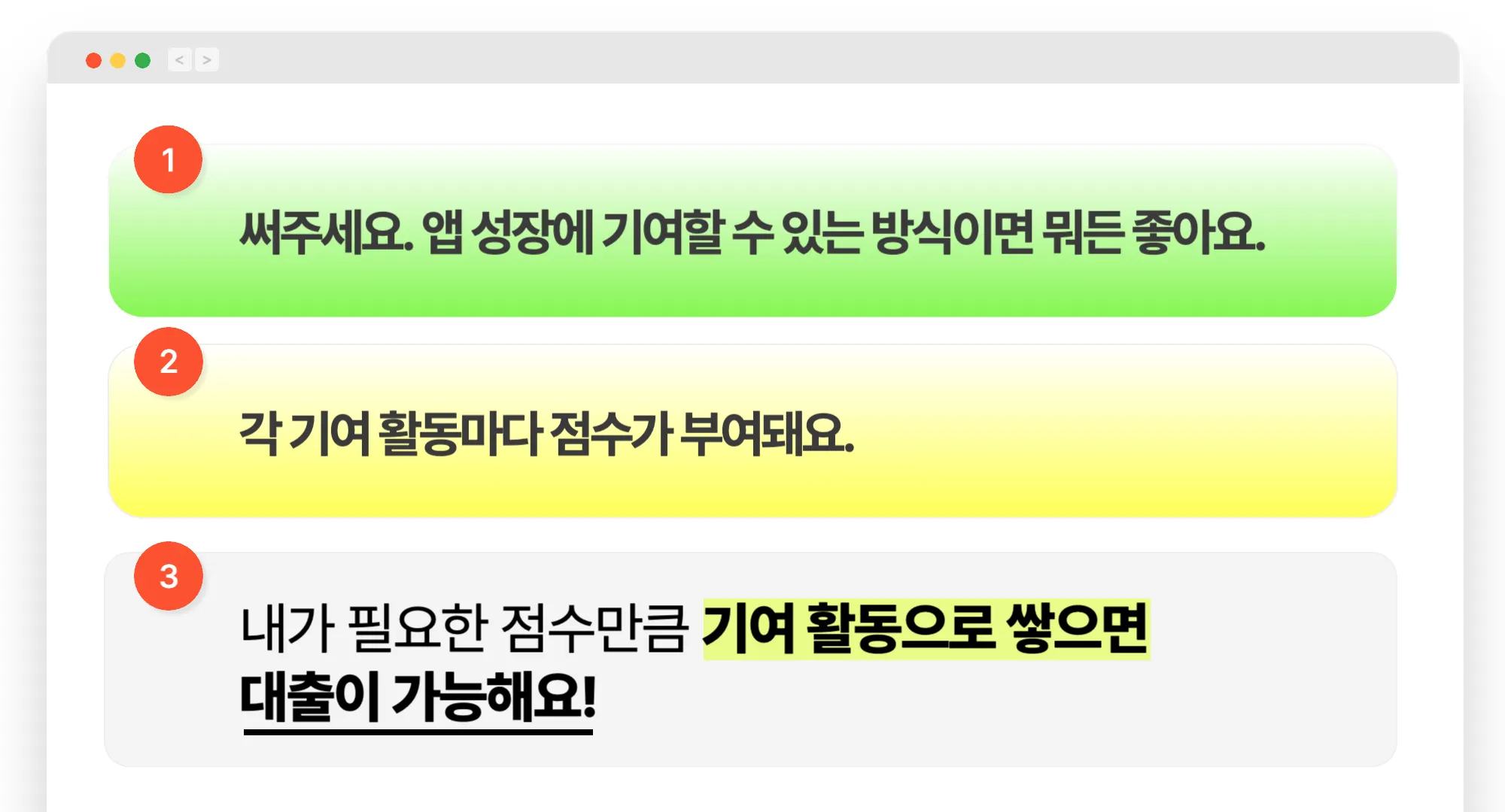 각 기여 활동에 부여되는 점수와 평가 방식은 [앱 성장에 기여하고 돈 빌리기] 방식이 정식 출시된 후 공개돼요.
